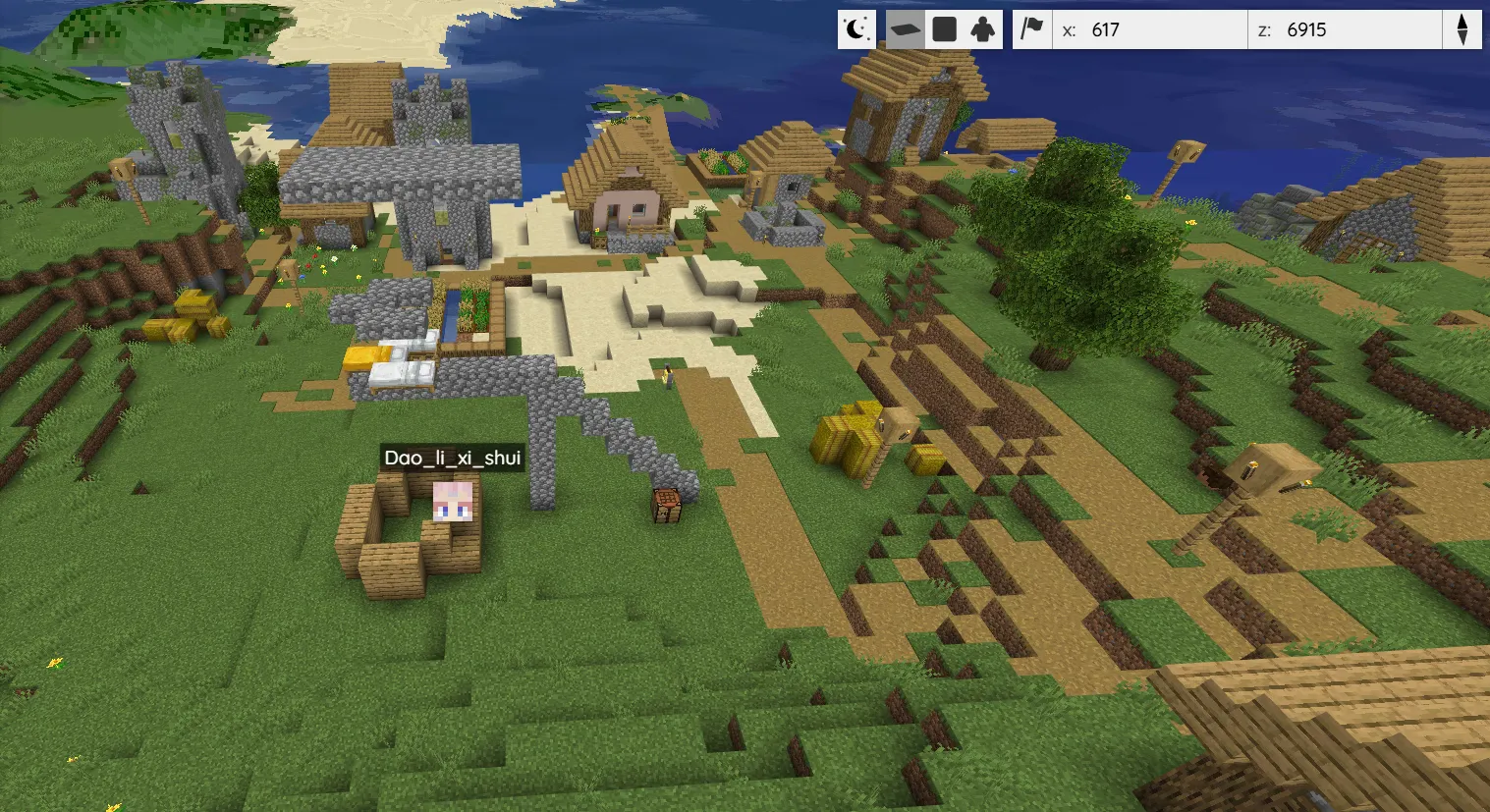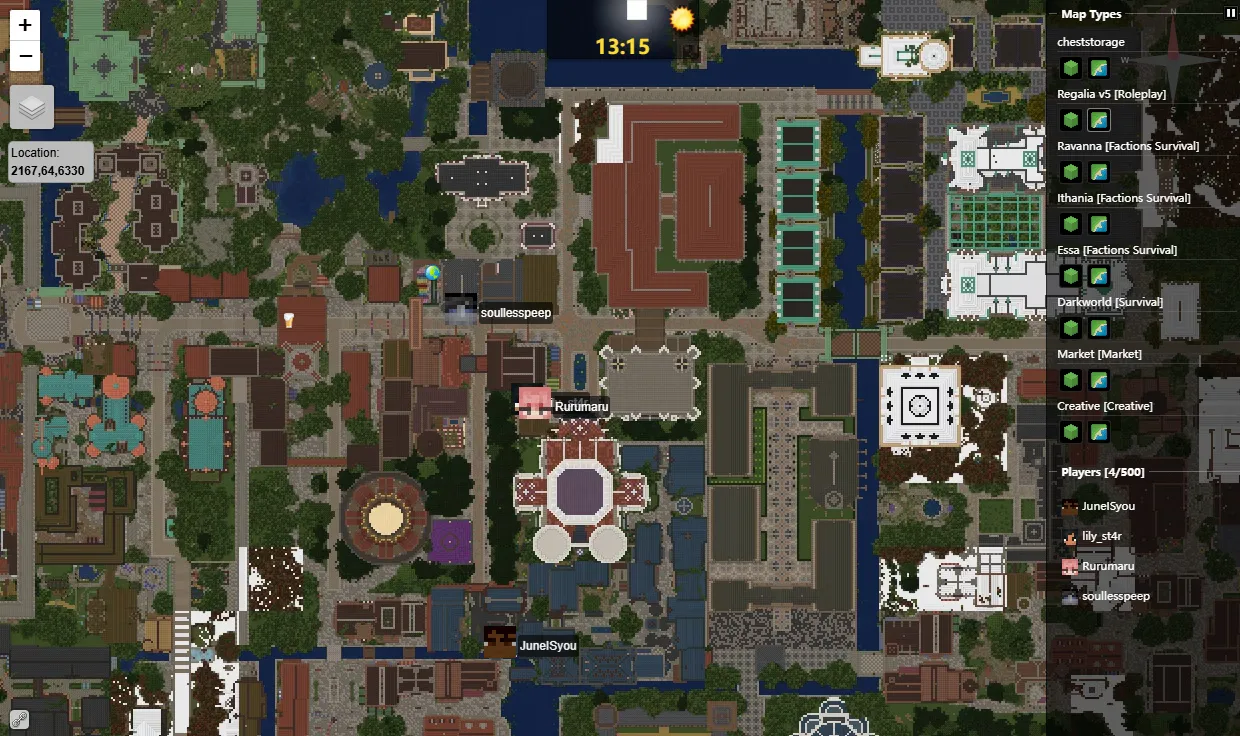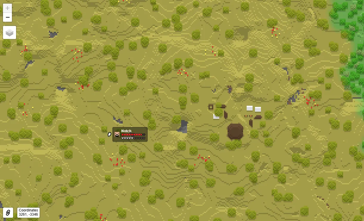 Section titled “Dynmap”一款历史悠久的卫星地图 mod,支持用户在浏览器上查看服务器内的地图、玩家信息和其它一些附属功能,例如出生点、当前时间、是否下雨等,支持 2D 俯视角视图和 3D 俯视角视图查看。
