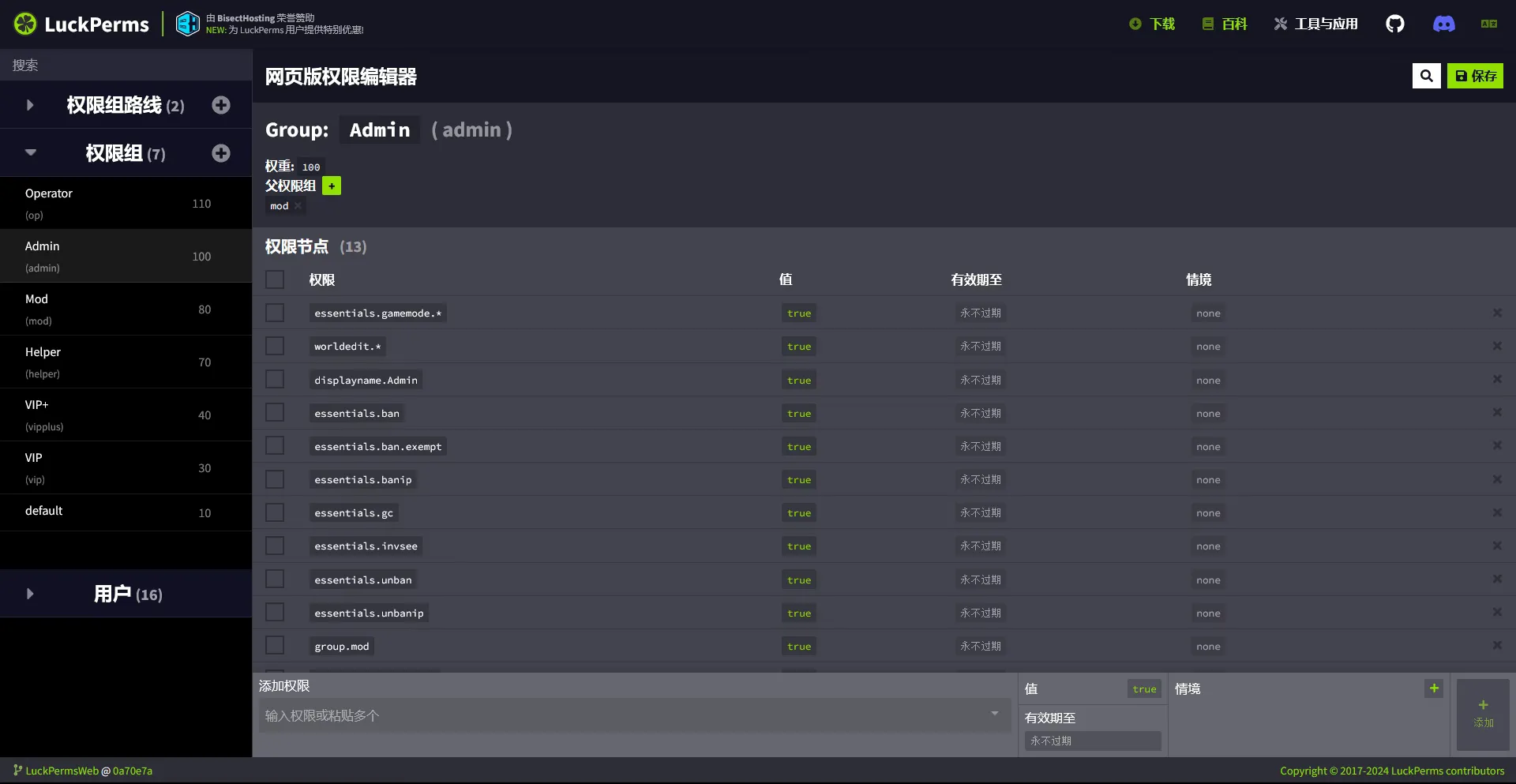 • Luck & (essentials | worldedit) - 匹配 ‘essentials’和’worldedit’ 开头的权限检查。